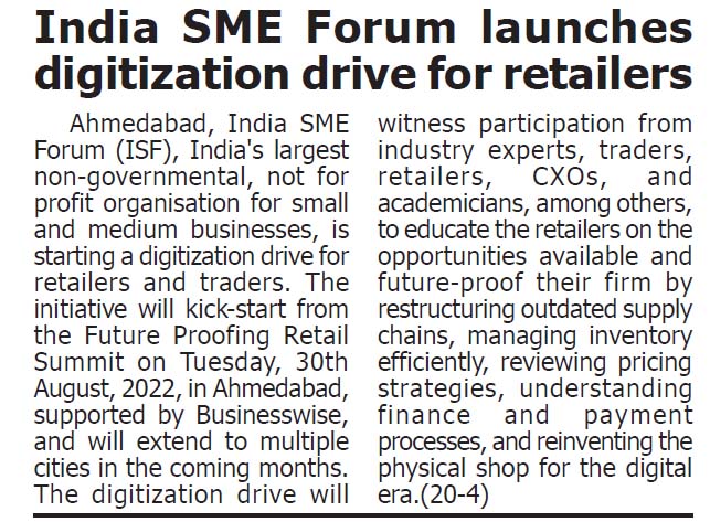 20 | 02-Sep | India SME Forum Launches digitization drive during Future Proofing Retail Summit | Western Times | view |