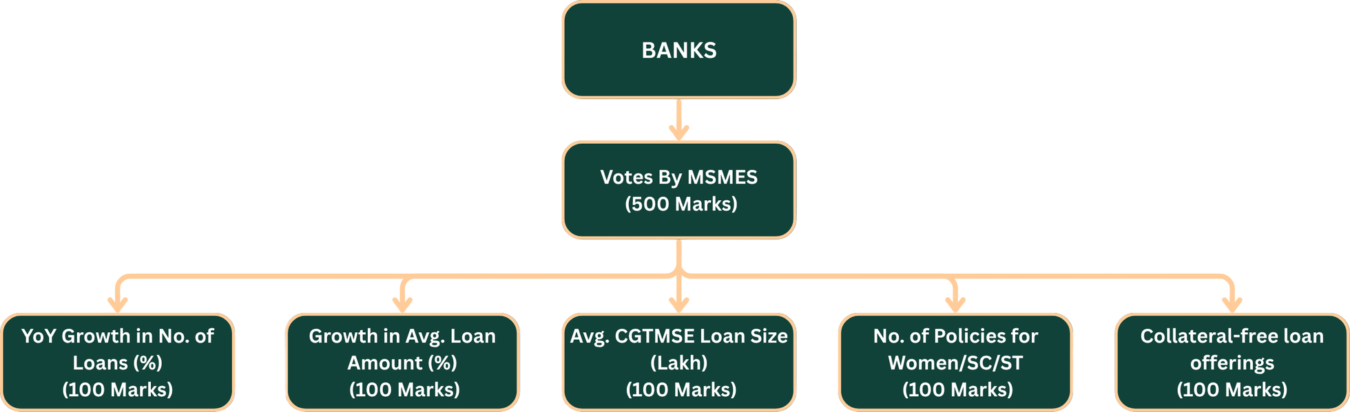 Assessed on collateral-free loan offerings (100 marks), schemes for marginalized communities (100 marks), growth in loan disbursements (100 marks), year-on-year loan expansion (100 marks), and average CGTMSE loan size (100 marks).