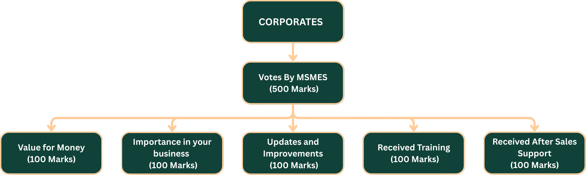 Evaluations are conducted with precision, assigning 500 marks per category collected via a detailed survey methodology from MSMEs across India.