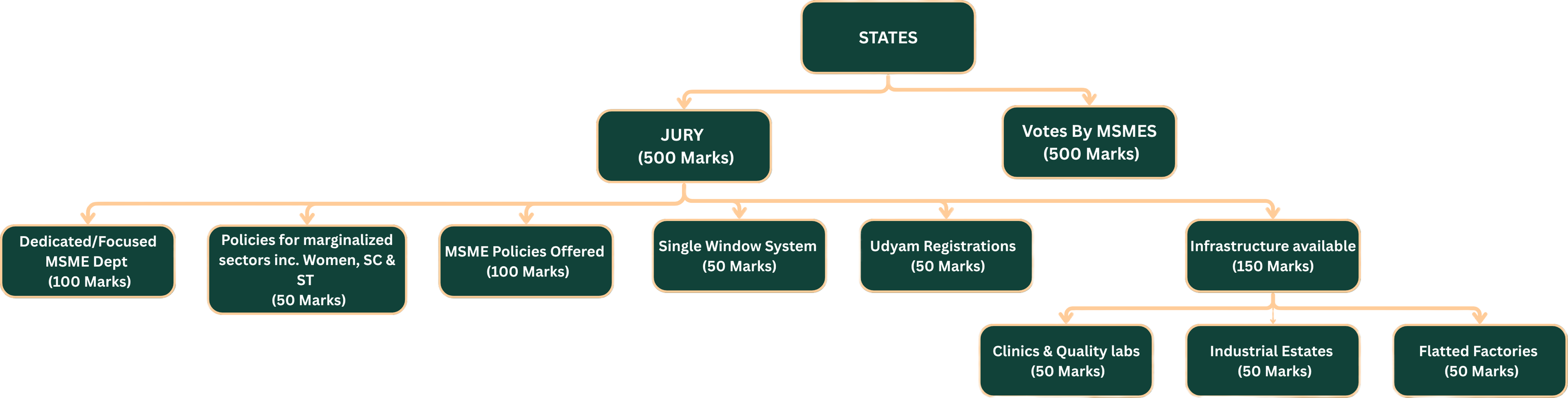 Evaluations are conducted with precision, assigning 1000 marks, split between an Esteemed Jury (500 marks) and MSME responses (500 marks) collected via a detailed survey methodology.