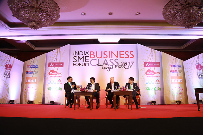 Speakers(L-R) Shri Vinod Kumar,President,India SME Forum;Shri J P Singh,President-SME,Axis Bank;Shri Neeraj Kulshrestha,CBO,BSE SME;Shri T R Bajalia,Former DMD,SIDBI;Shri Hemendra Mathur,Venture Partner,Bharat Innovations Fund