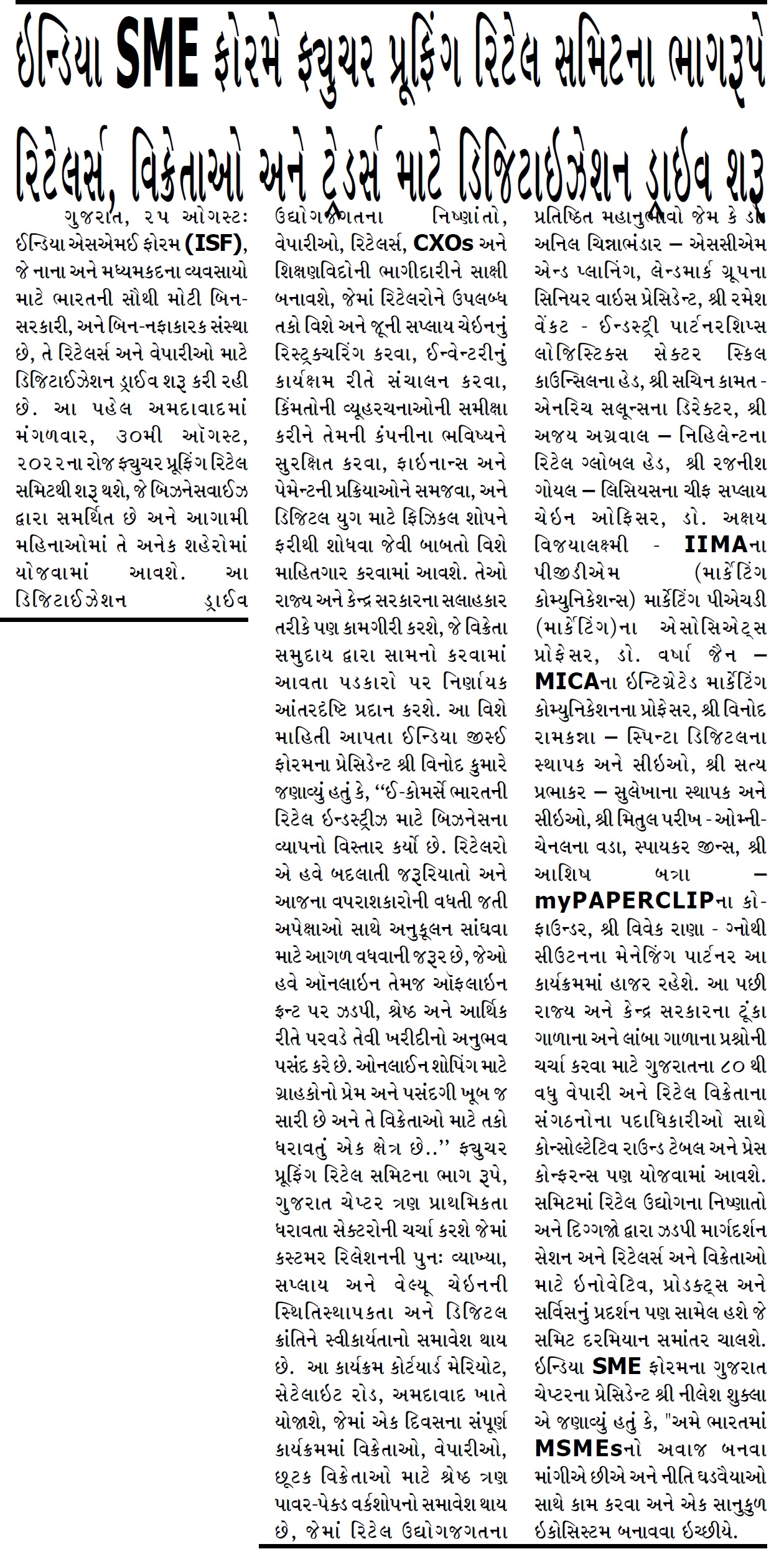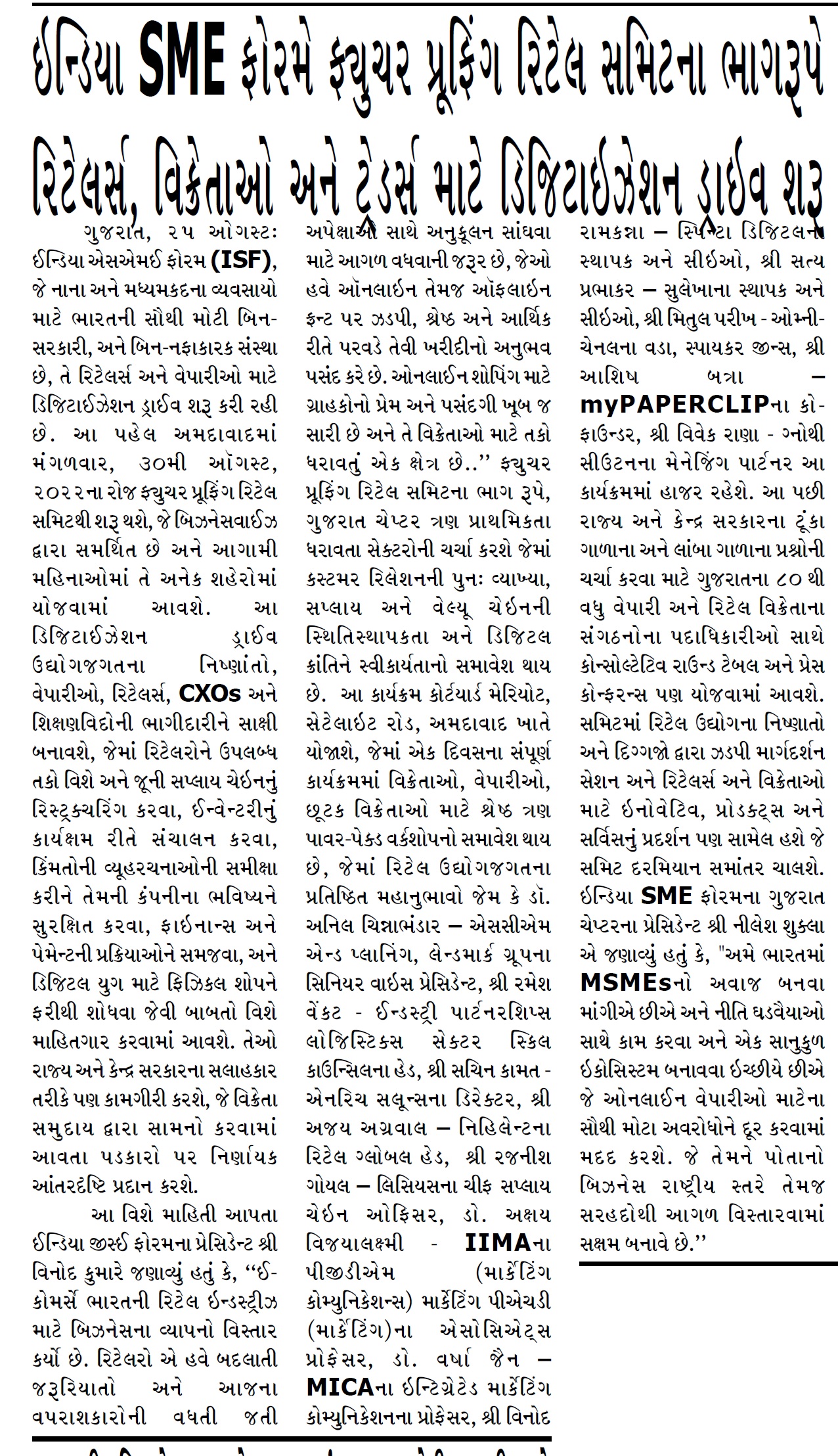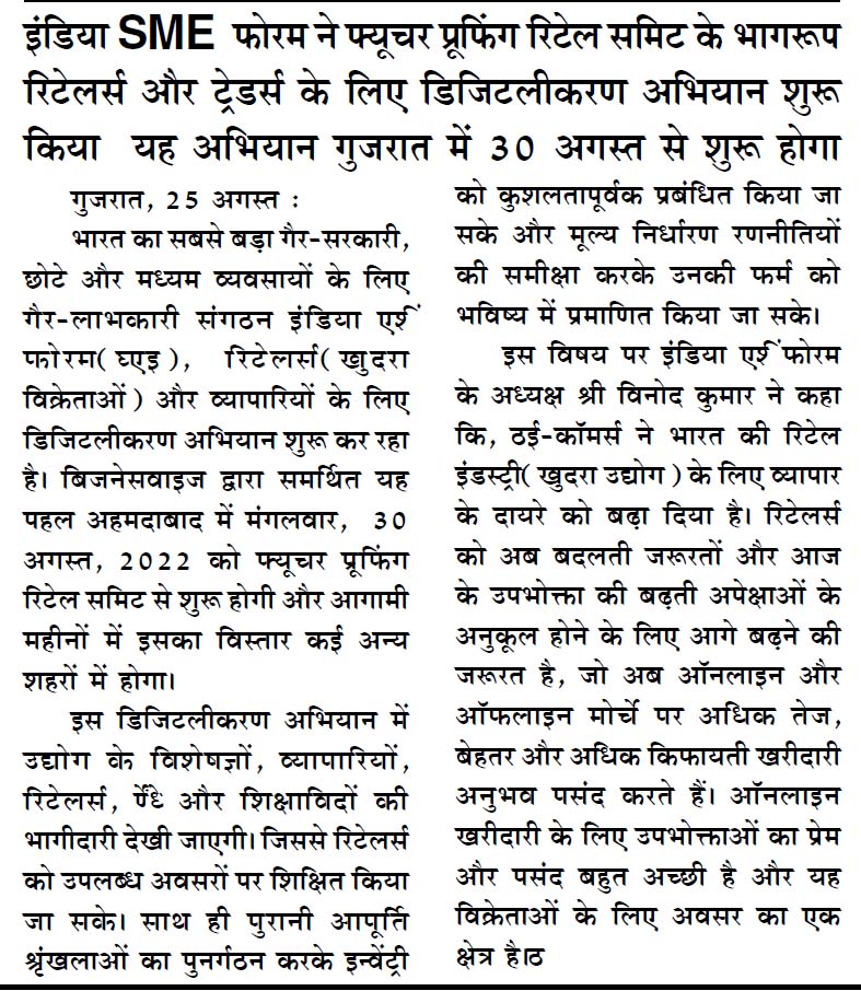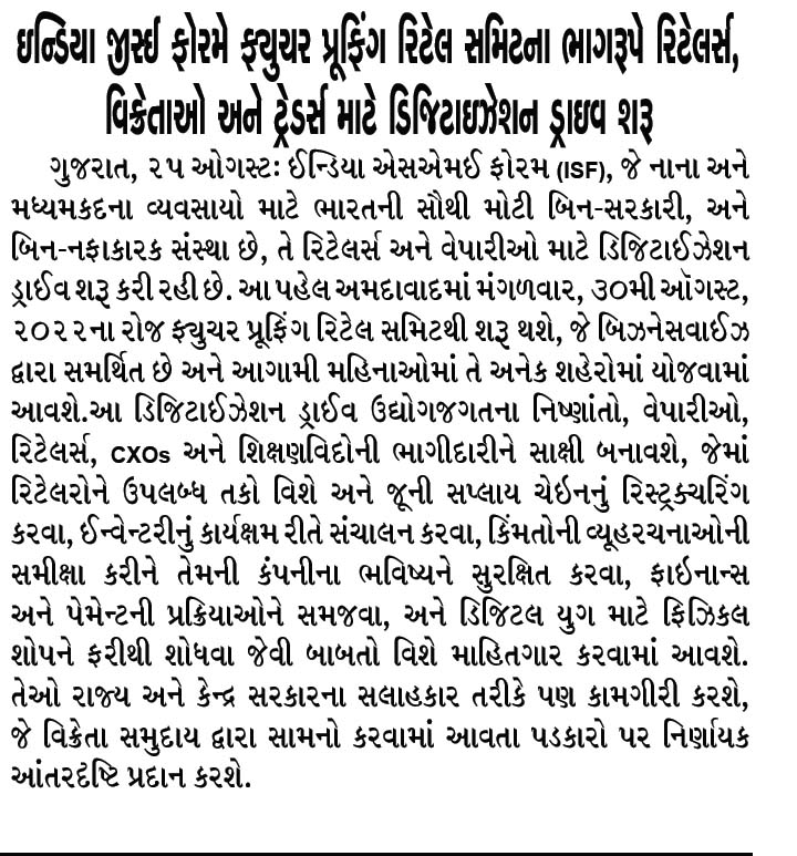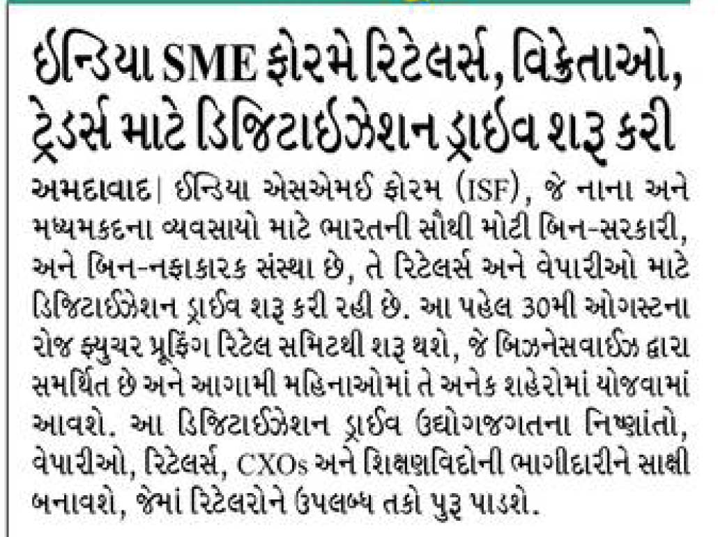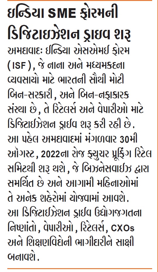 28 | 30-Aug | India SME Forum Launches digitization drive during Future Proofing Retail Summit | Gujarat No Beli | view |