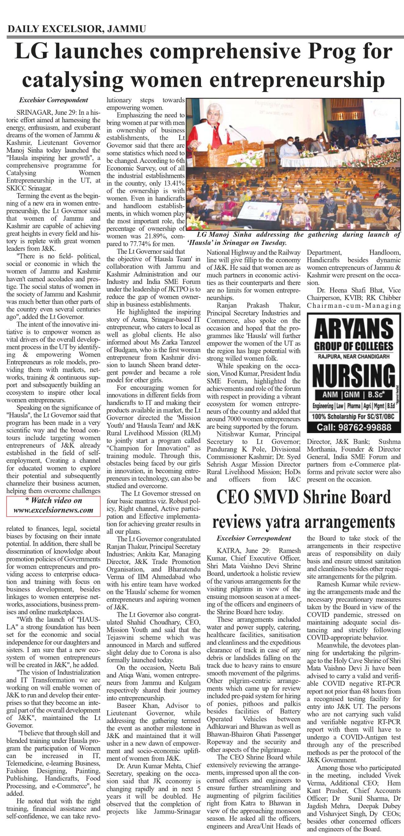 | 621 | 30-06-2021 | DailyExcelsior | LG launches comprehensive Prog for catalysing women entrepreneurship | Online | View details | |