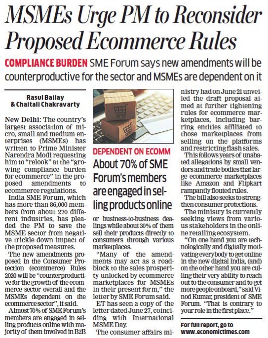 | 653 | 07-07-2021 | Economic Timees | MSMEs urge Prime Minister Modi to reconsider proposed e-commerce rules | Online | View details | |