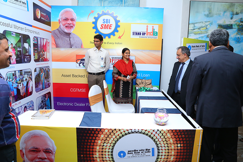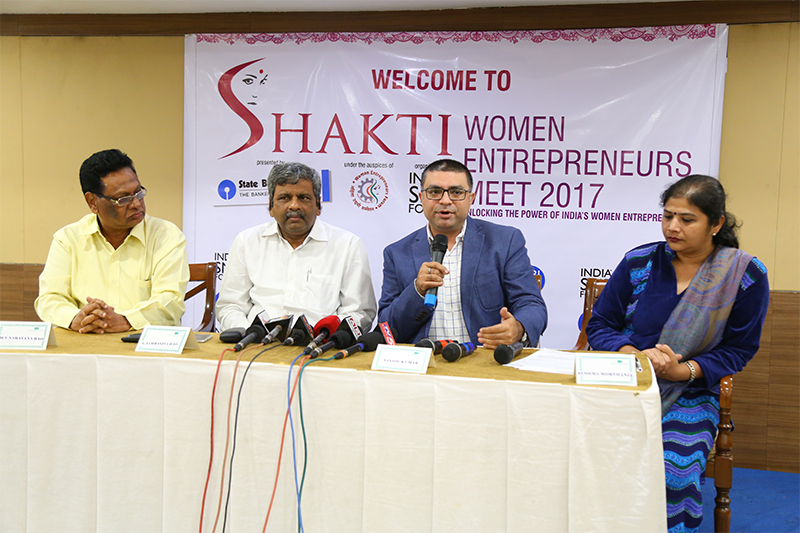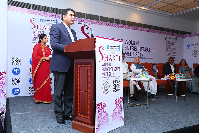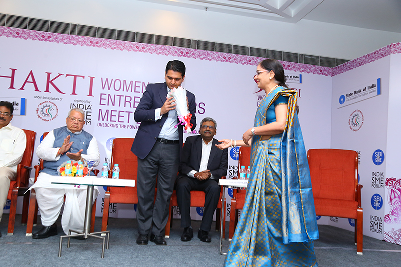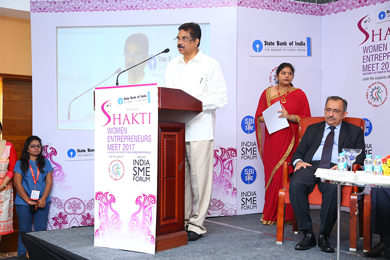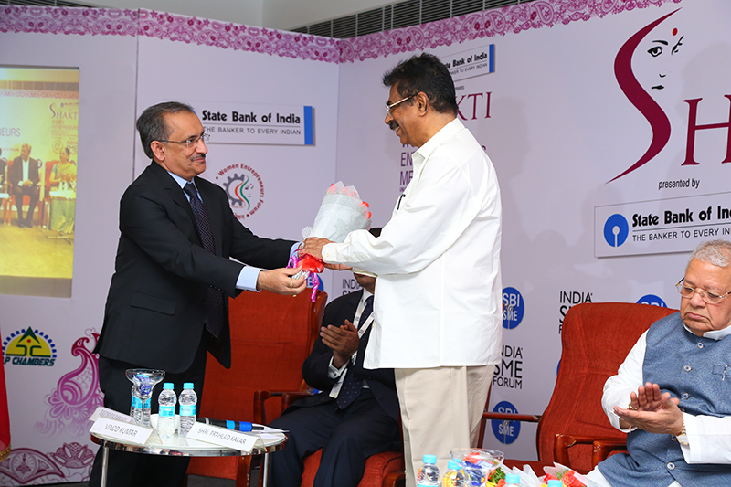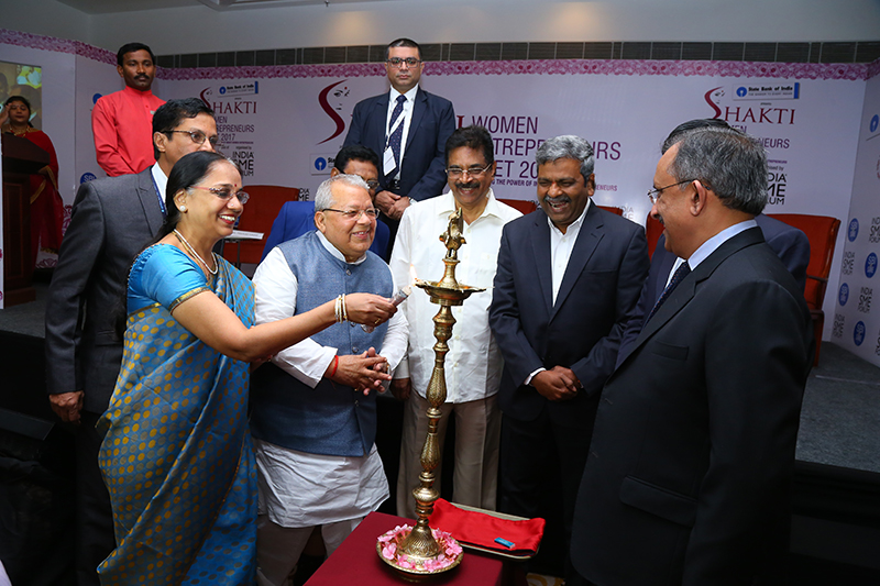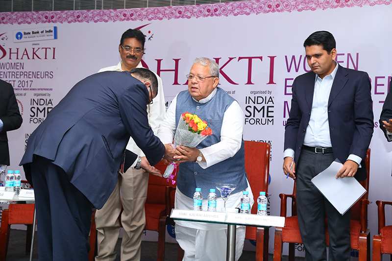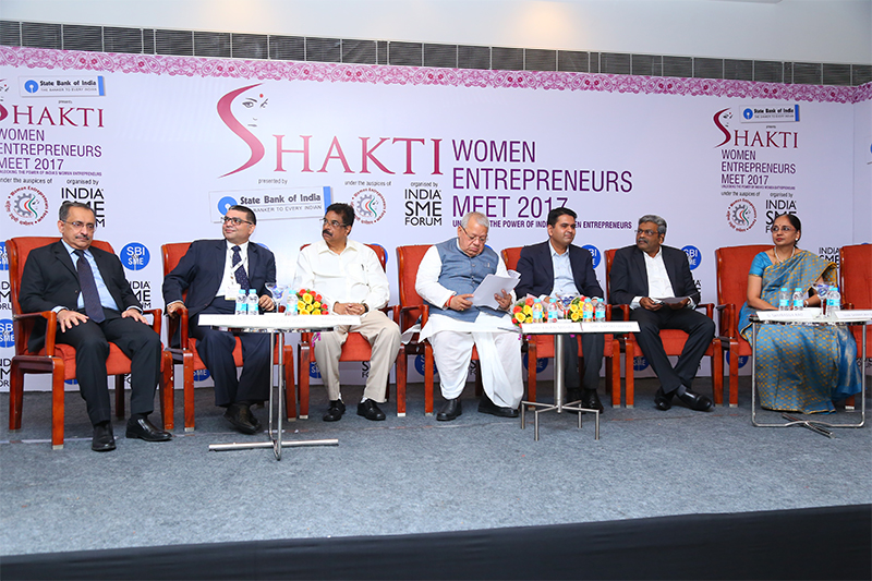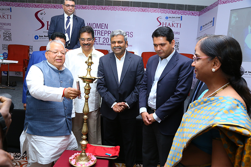 Shri Kalraj Mishra, Hon'ble Minister of MSME,Govt of India; Shri Kartikeya Misra, IAS, Director Industry & CEO AP Invest, Government of Andhra Pradesh; Shri Hari Babu,MP,Andhra Pradesh; Shri. Prahlad kakar, AD Guru & Chairman India SME Forum; Smt. Uma Shanmukhi Sistla, GM- SME, State Bank of India, Corporate Centre, Mumbai; Shri Ravindra Pandey,GM,NW-2, Hyderabad Circle, SBI; Shri Sambasiva Rao,President Elect,AP Chambers & Shri. Vinod Kumar, President, India SME Forum lighting the lamp to mark the inauguration of Shakti Women Entrepreneurs Meet 2017